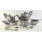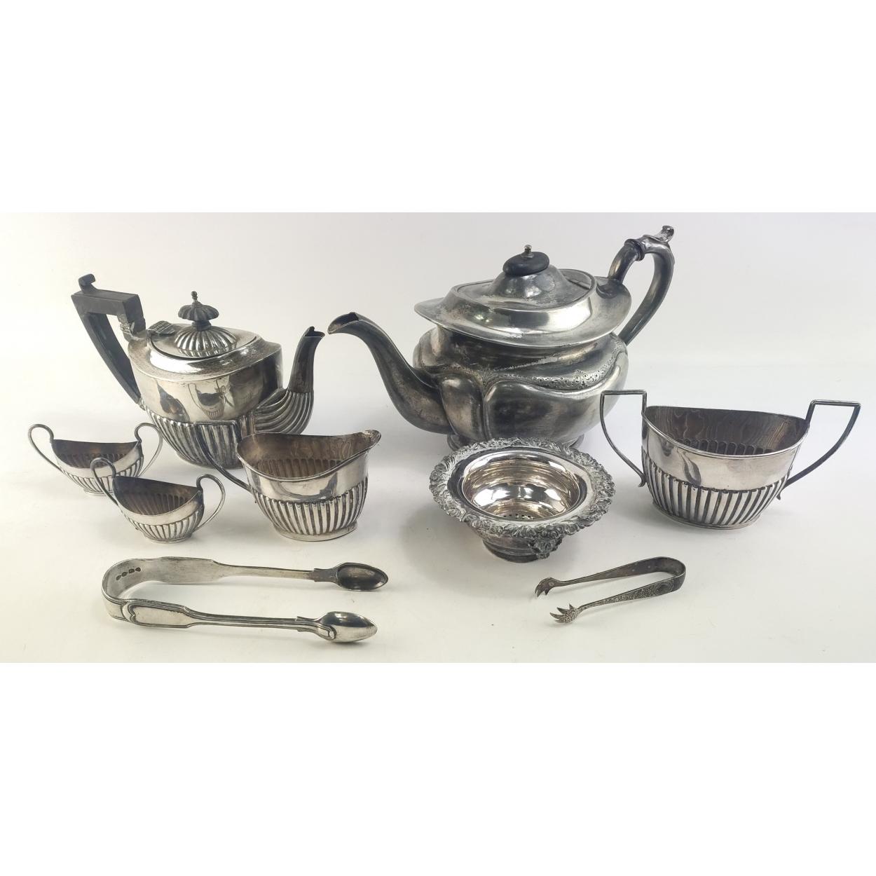 SEVEN silver items with Hallmarks to a delightful include a one cup small teapot and a substantial pair of sugar tongs etc - weight for all silver 558g approx - there is also a small pair of EPNS sugar tongs and an EPNS teapot