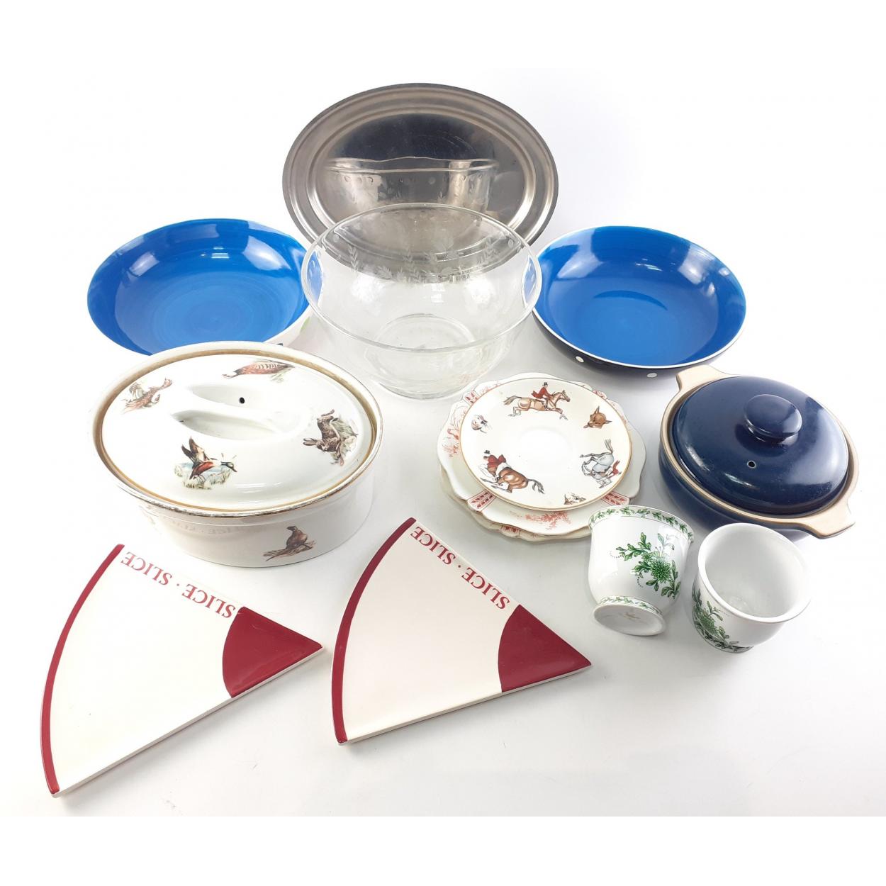 A good quality collection of ceramic kitchen ware pieces to include APILCO lidded casserole dish with game birds and Hares, a DENBY casserole dish, a very attractive large crystal bowl and others.