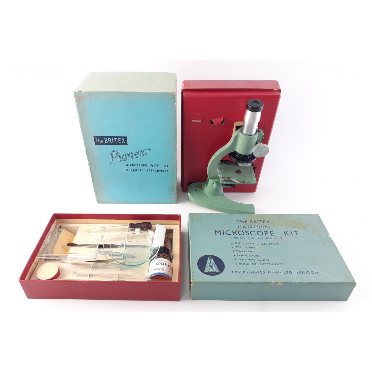 A boxed BRITAX Pioneer microscope with accessory kit. Appears in good well stored coondition.