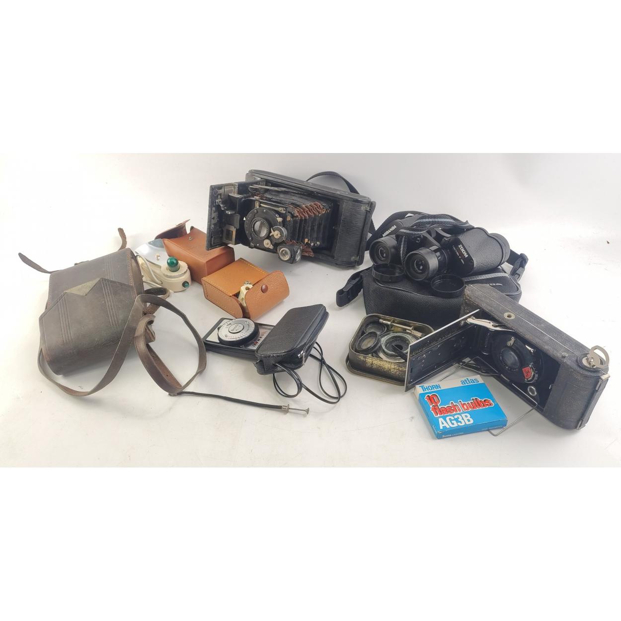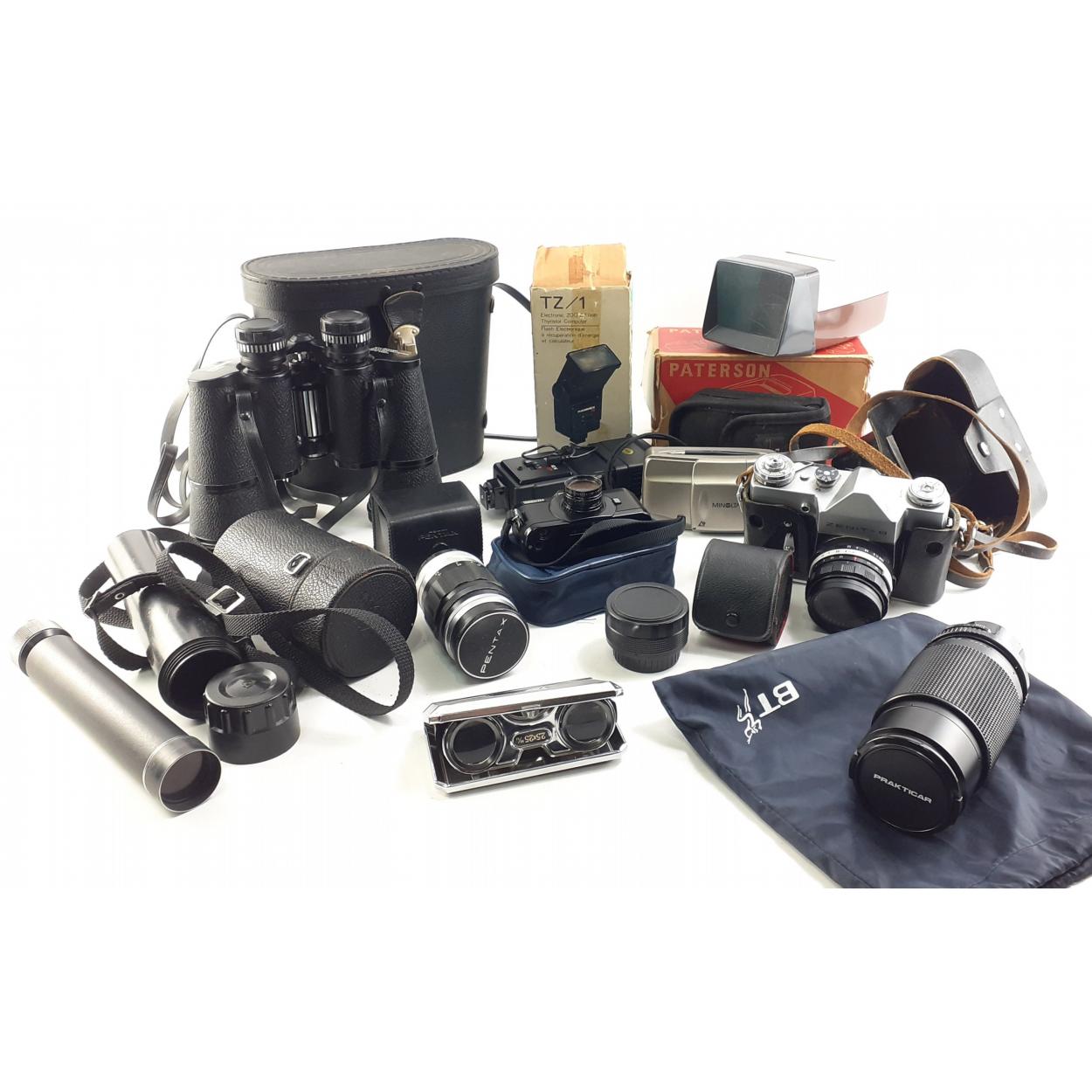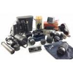A good photography lot. ZENIT-B in case with Soligor 1: 3.5 Lens, also a Praktica 1: 4.5 80-200m Lens, Takumar 1: 3.5mm lens, sighting scope, other small portable camers and binoculars.