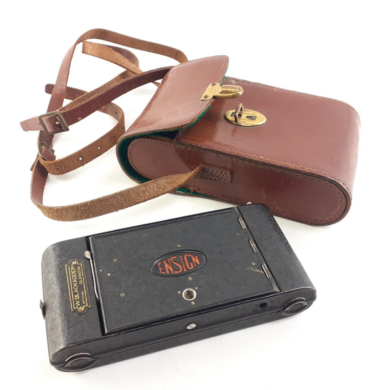 Antique ENSIGN folding camera with Blackadder of Glasgow labels. Mechanism and bellows appear to be in good order. In leather case.