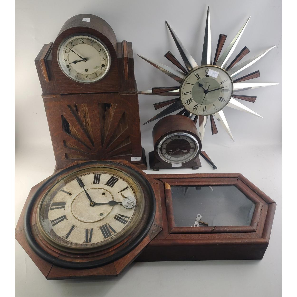 A collection of four vintage clocks and an antique wooden speaker. All untested.