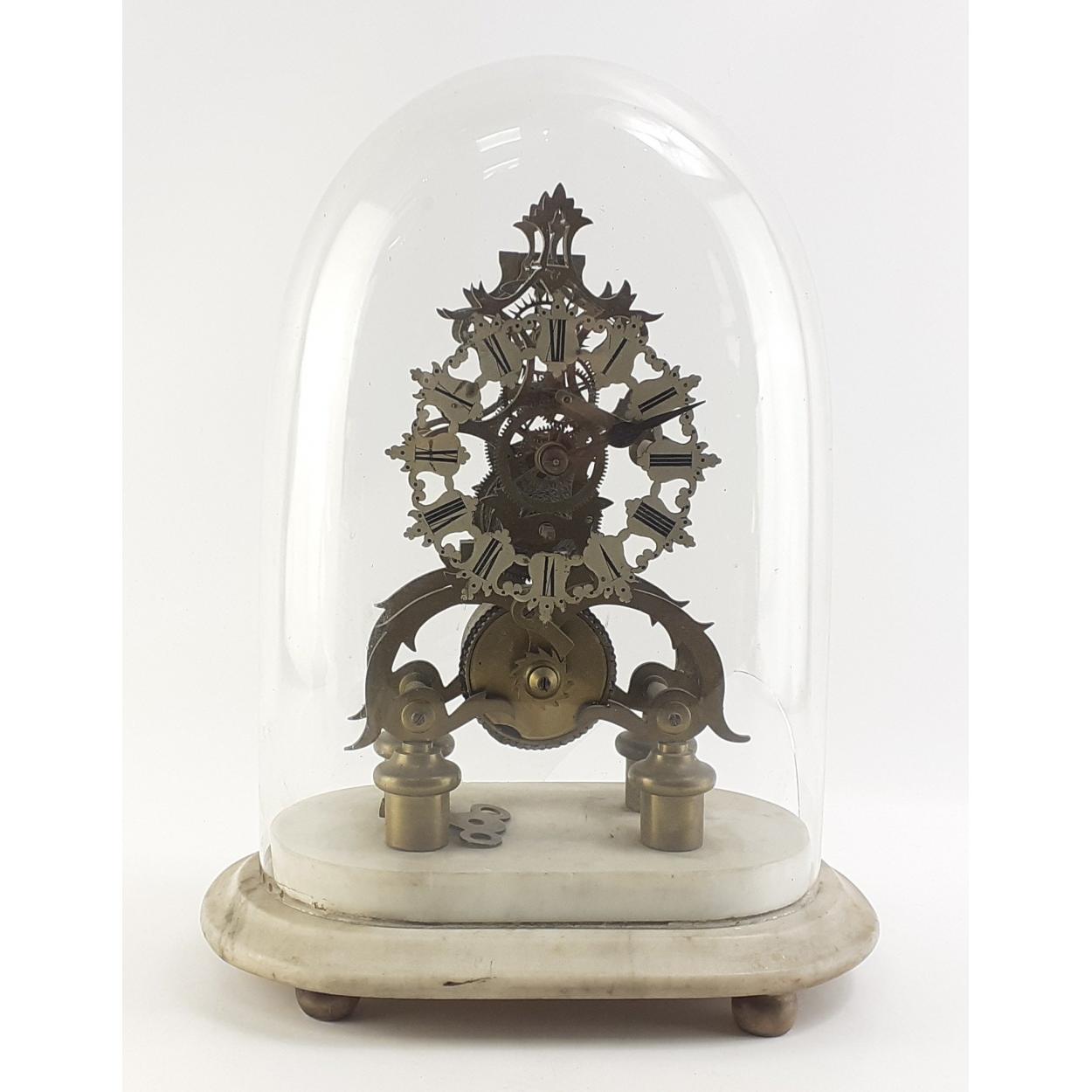 An unsigned SUPERB antique brass skeleton mantle clock with pendulum in glass dome complete with marble base. A very appealling timepiece but the bottom corner of the glass dome is broken/missing. Stands 36cm to top of dome. Clock untested.