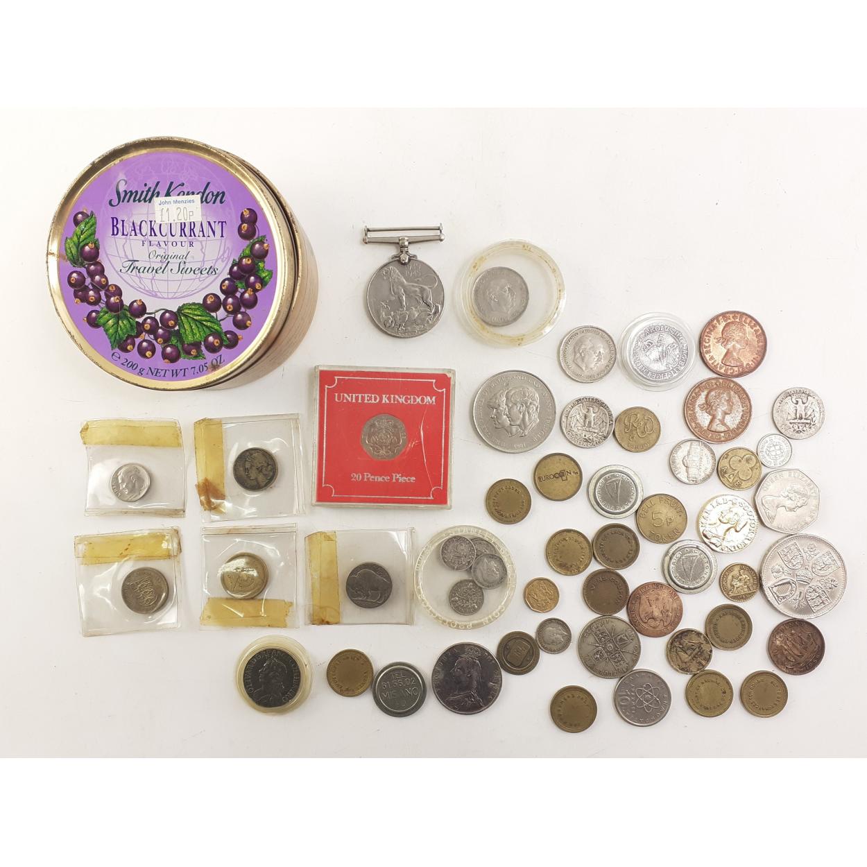 A wee tin of coins. To include some silver 3ds, a brooched victorian coin, some tokens and a WWI Imedal.
