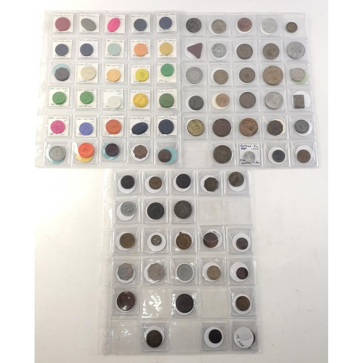 TOKENS Over 100 mainly USA / Canada tokens in five sleeves. Many US Brass Dog tags, Dairy tokens and many Transit tokens. A good lot well stored, much of interest. .
