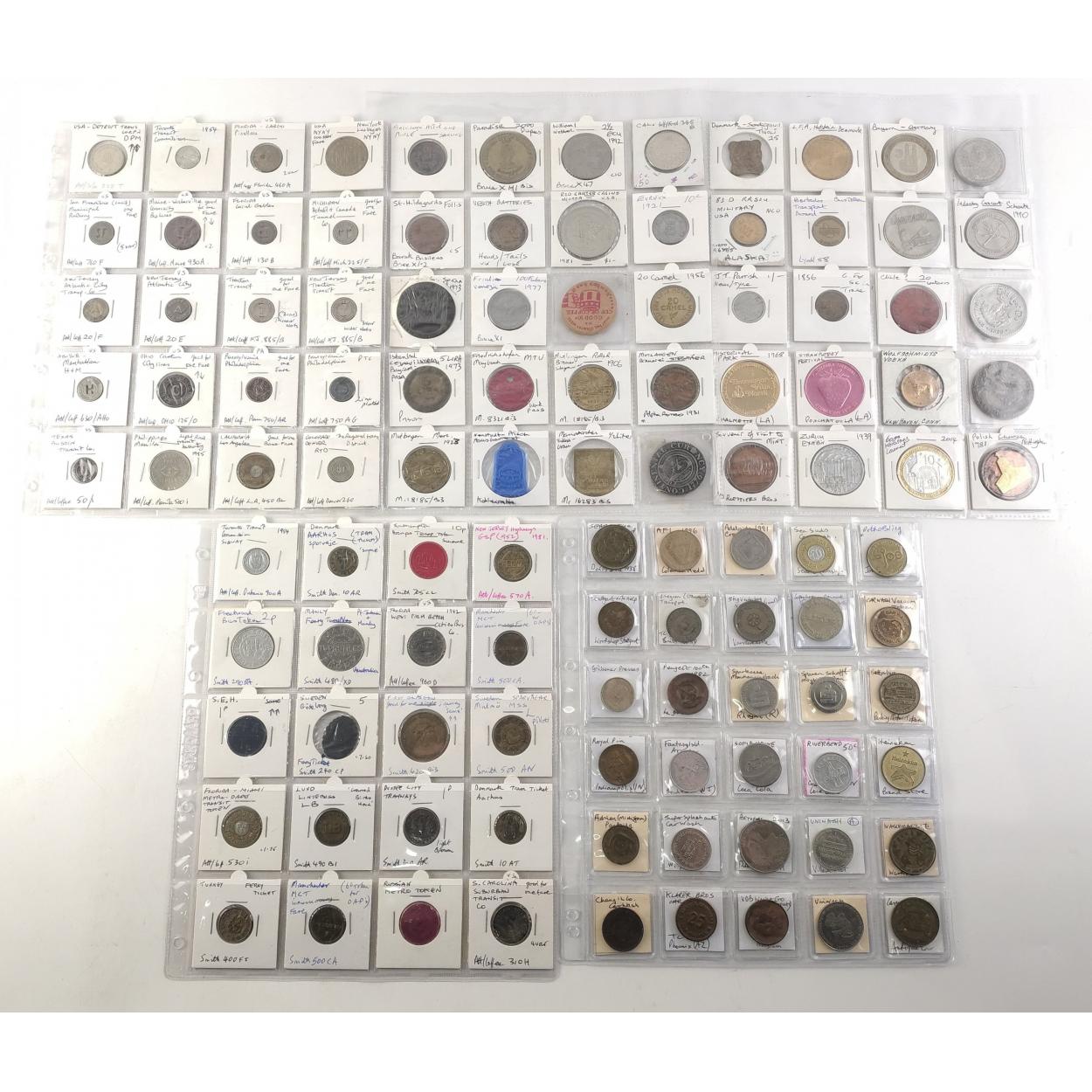 TOKENS 95 assorted tokens. Many USA and world transit tokens. All well stored in sleeves.