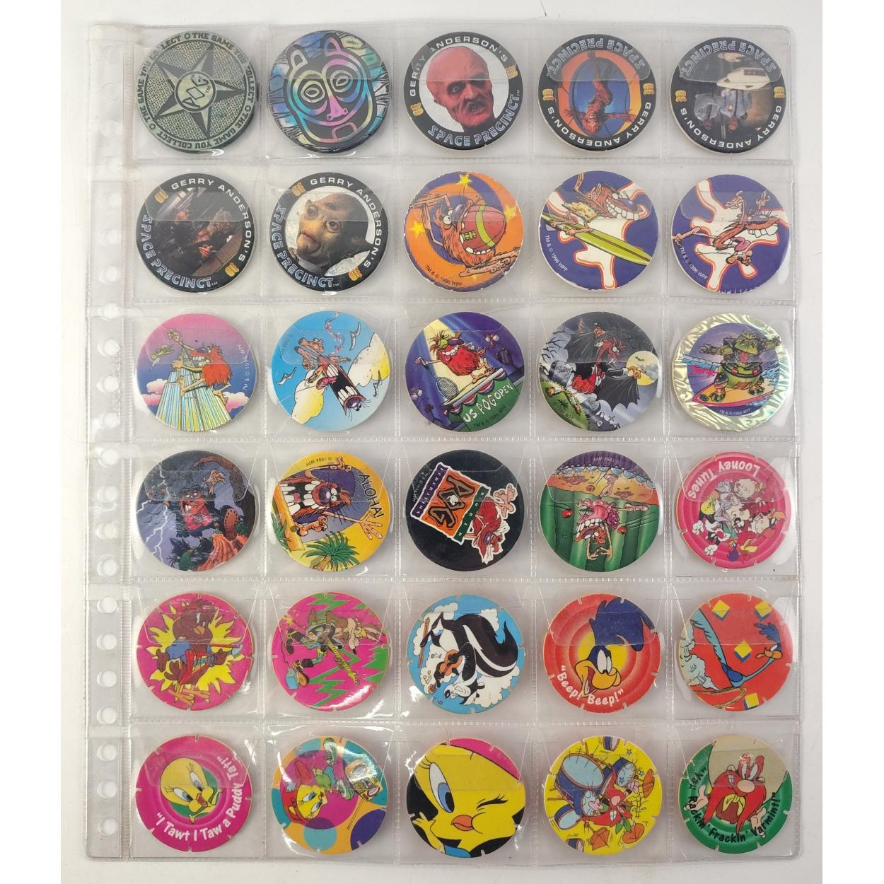 A sheet of 30 assorted TAZO & POGs Includes Tazo number 1 Yosemite Sam. All good well stored.