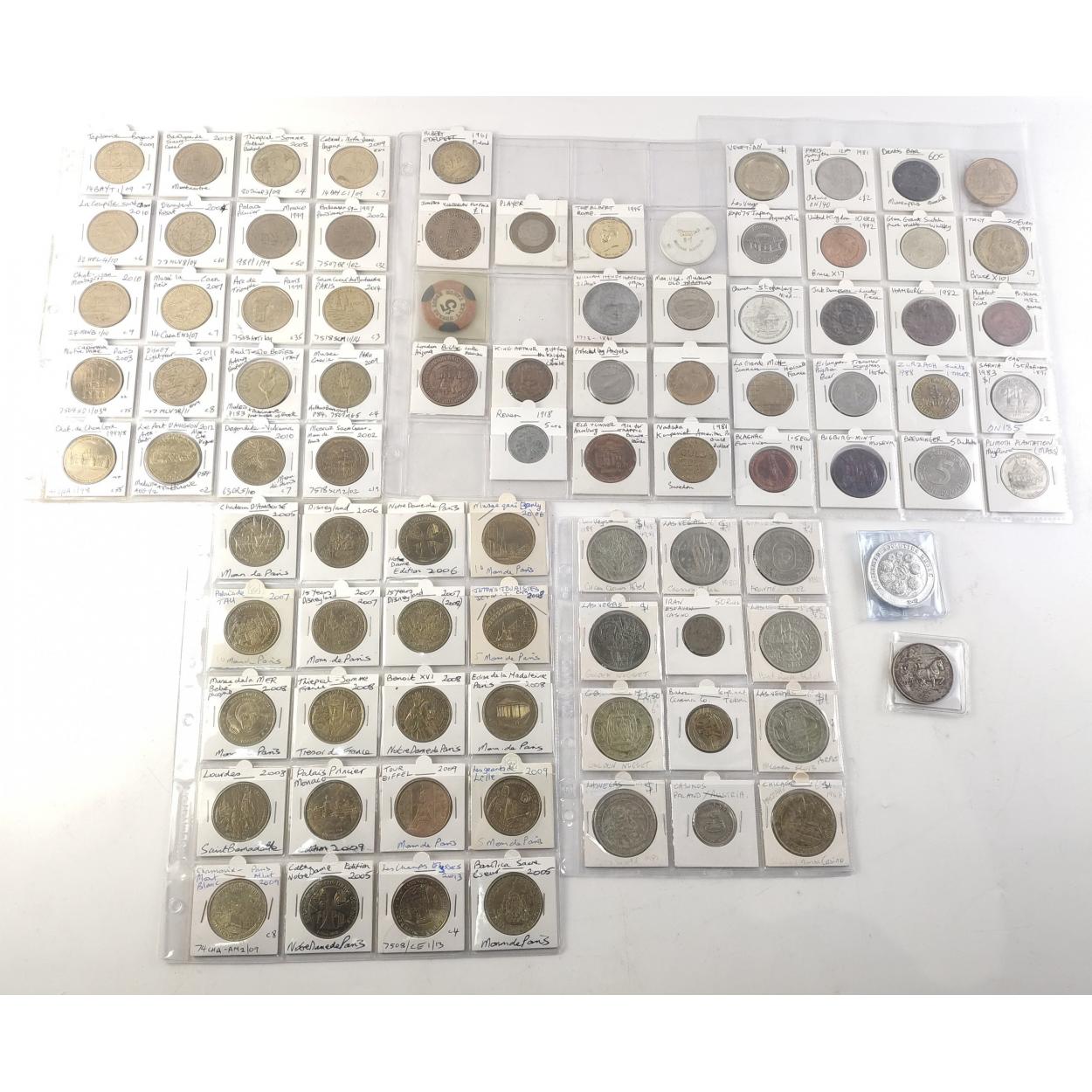TOKENs Over 100 assorted USA and World tokens. Incldes US transit and European assorted including commemoratives, Peugeot 100 years etc.