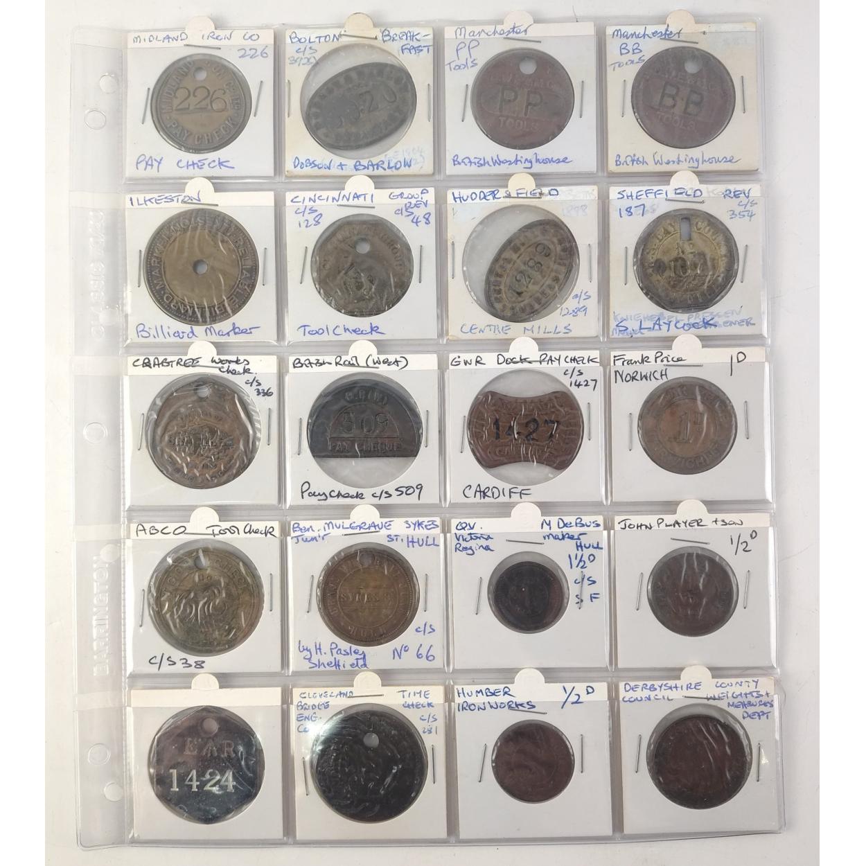 TOKENS Twenty United Kingdom BRASS tokens and checks. Midland Iron Token, Breakfast token, Tools tokens, Billiard Marker, Mills, Pay Check, British Rail, Weights & measures, Ironworks etc. A very collectible lot.