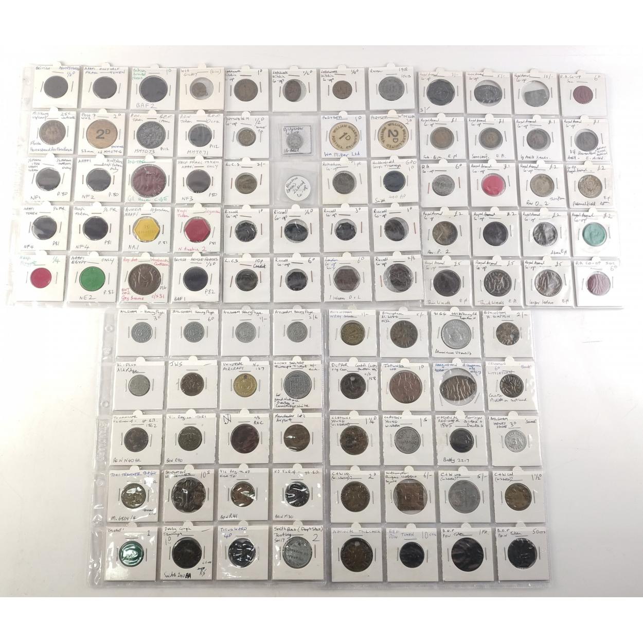 TOKENS 100 United Kingdom many co-op, some WWII military interest, NAAFI, POW tokens, Armed Forces Trade etc. A very interesting lot.
