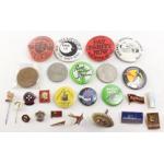 An interesting wee box of vintage button and badges with some coins. Includes some Russian, N.U.M etc.