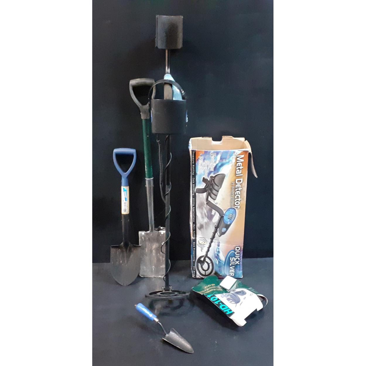 A Budding metal detectorist lot to include a QUICK SILVER METAL DETECTOR 2 SPADES AND HEADPHONES.