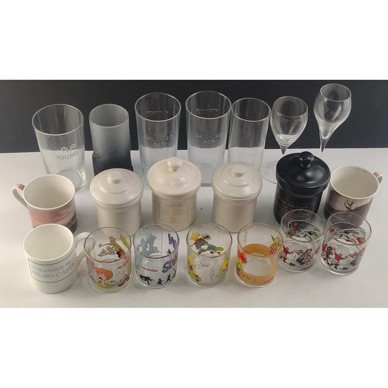 Mixed lot. Comprising 4 x LONG CLAWSON lidded jars, cartoon glasses and two football glasses and others.