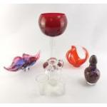 Selection of glassware to include orange art glass, blue and gold scent bottle, oversized goblet, purple art glass and antique etched water jug with 2 matching glasses