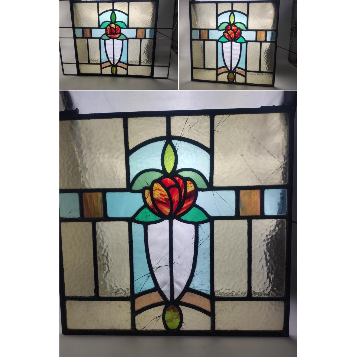 Three stained glass window panels. THe largest measures 70cm x 50cm. Some age related cracks and damage.