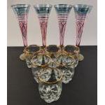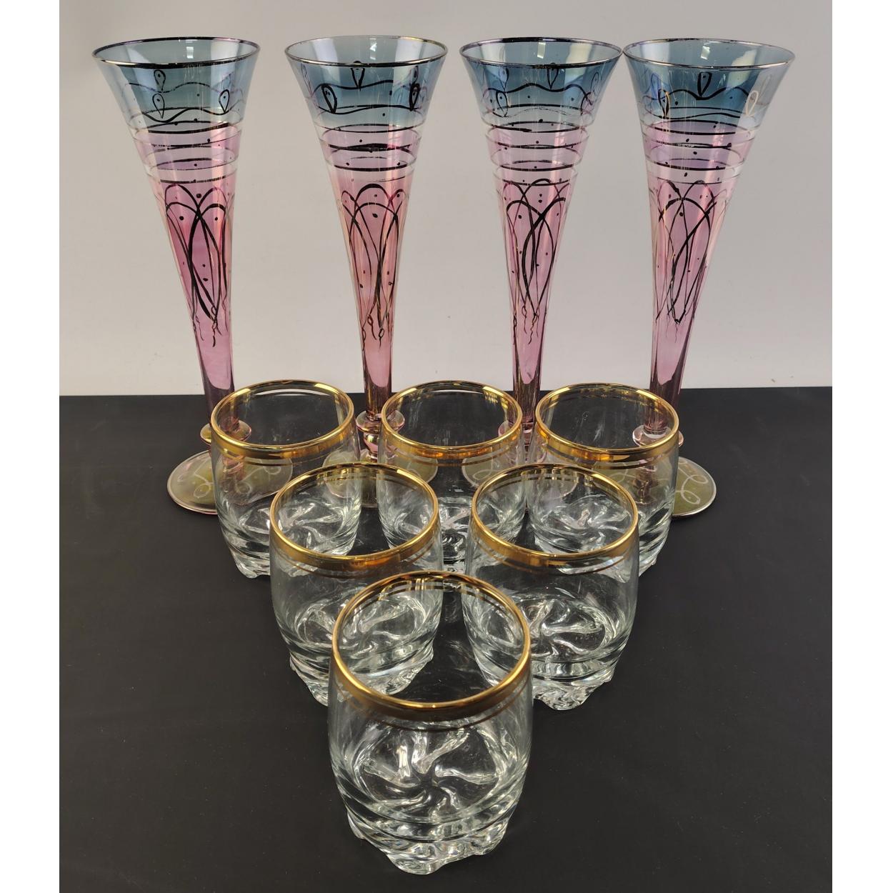Four stylish tall Ventetian style Champagne Flutes with gilt finish. Also six stylish whisky tumblers.
