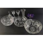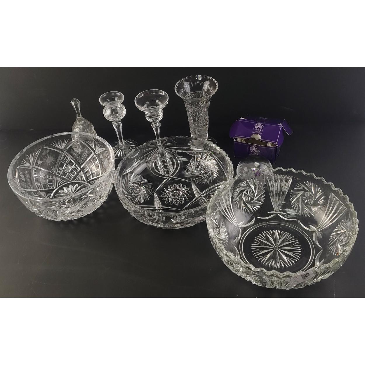 Mixed crystal lot comprising bowl, Stuart Crystal candle holders, Edinburgh Crystal paperweight. All in good condition.