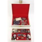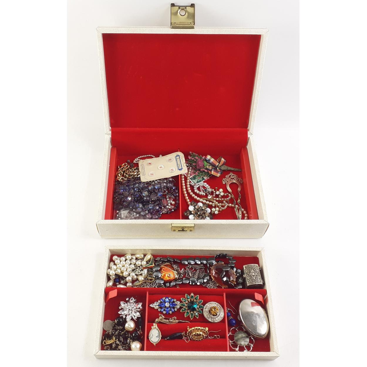 A good quality jewellery box with contents. Some very attractive brooches, earrings and other bling.