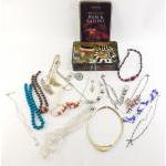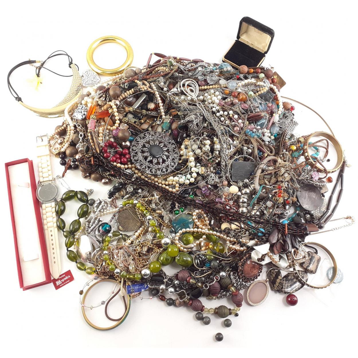 An old confectionary tin stuffed with brooches, beads bangles etc. Interesting lot, something for everyone.