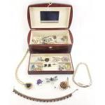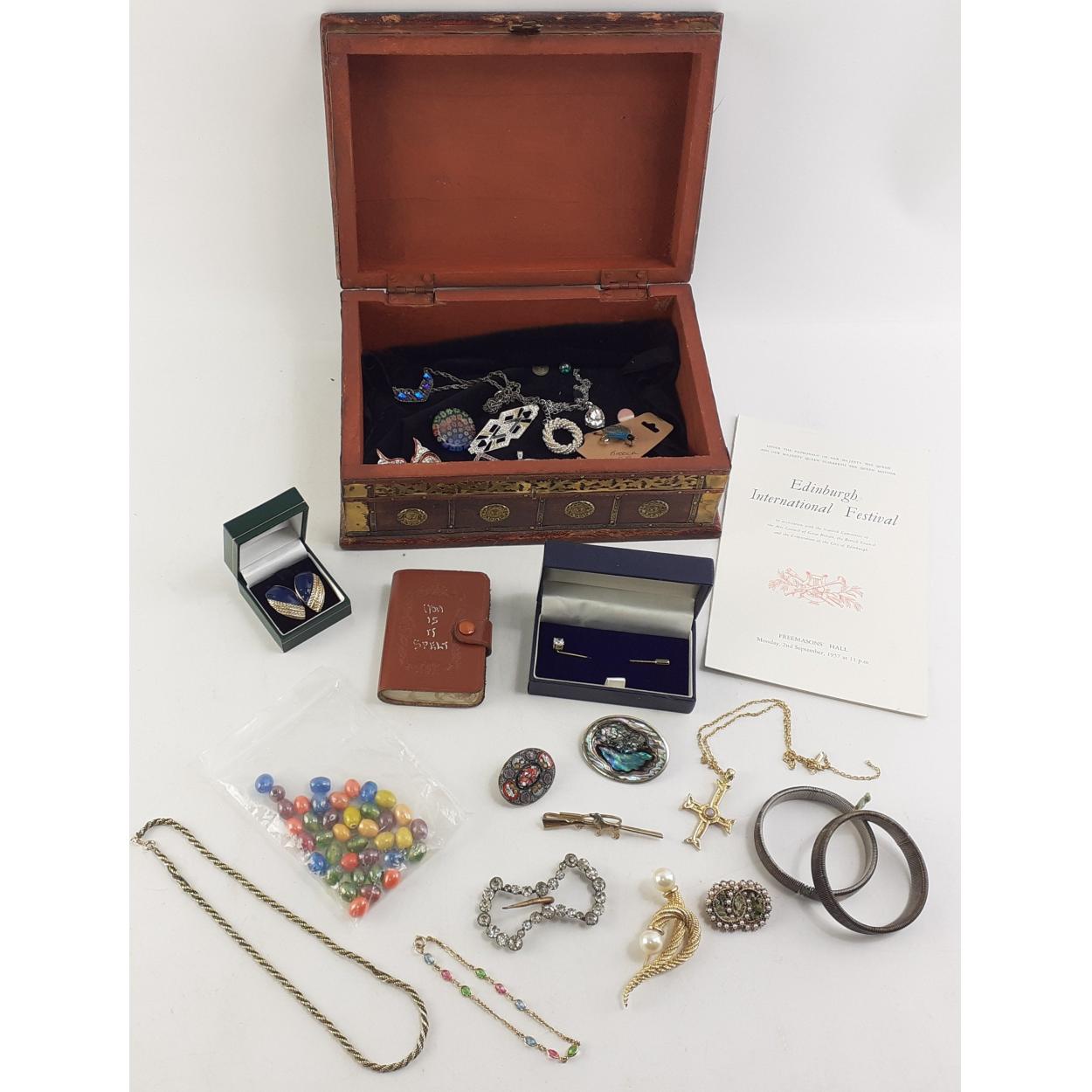 A chest style Jewellery box and contents. Pendants, brooches earrings, gilt crucifix. Includes a very pretty Italian micro mosiac brooch