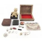 Mixed jewellery lot in a marquetry straw work style box, Small brooches , rings etc . Also a lovely wee BERG teddy.
