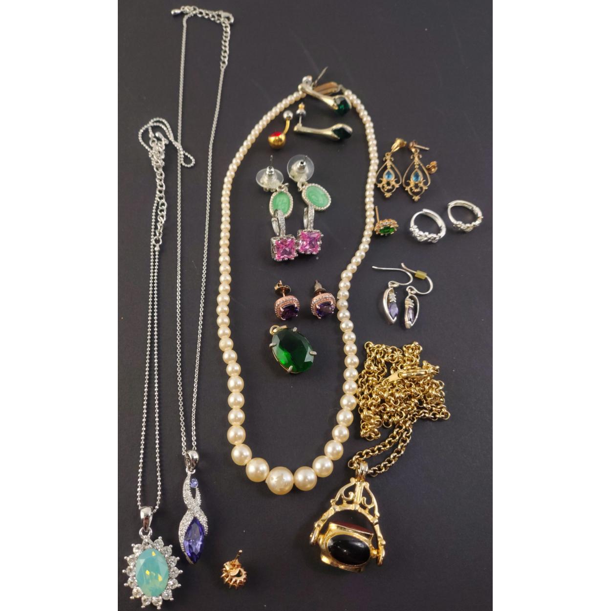 A nice pearl necklace and a collection of unmarked earrings etc bling jewellery
