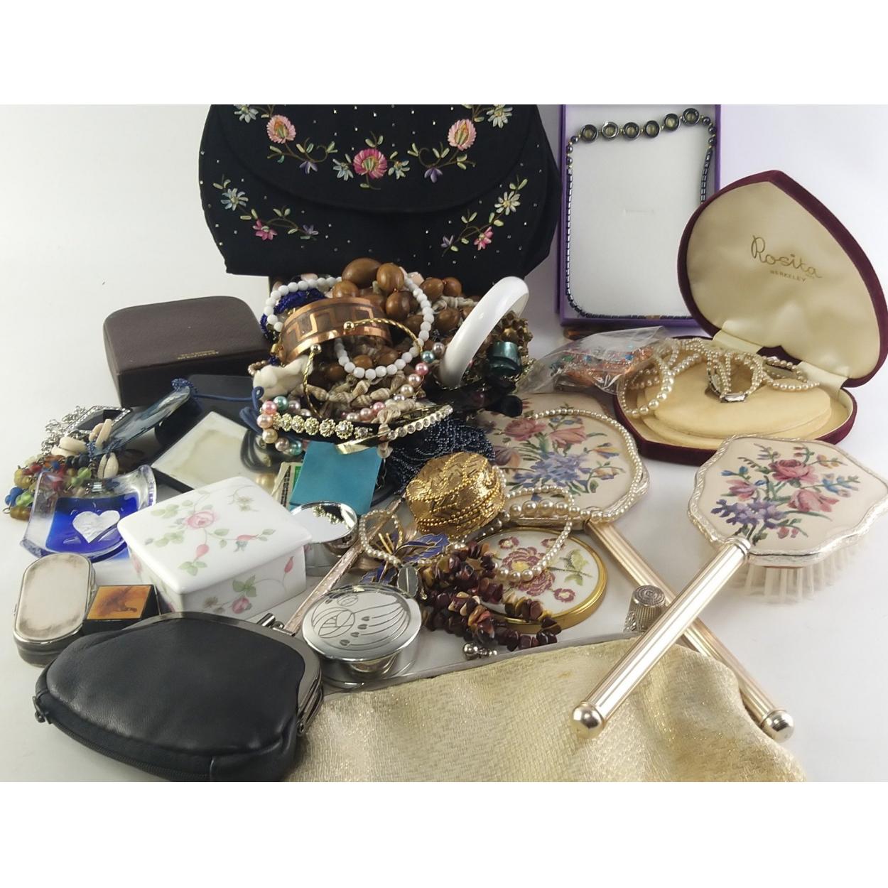 A great collection of vintage clutch bags,dressing table set and some good quality vintage jewellery including Pearls, brooches and much else.