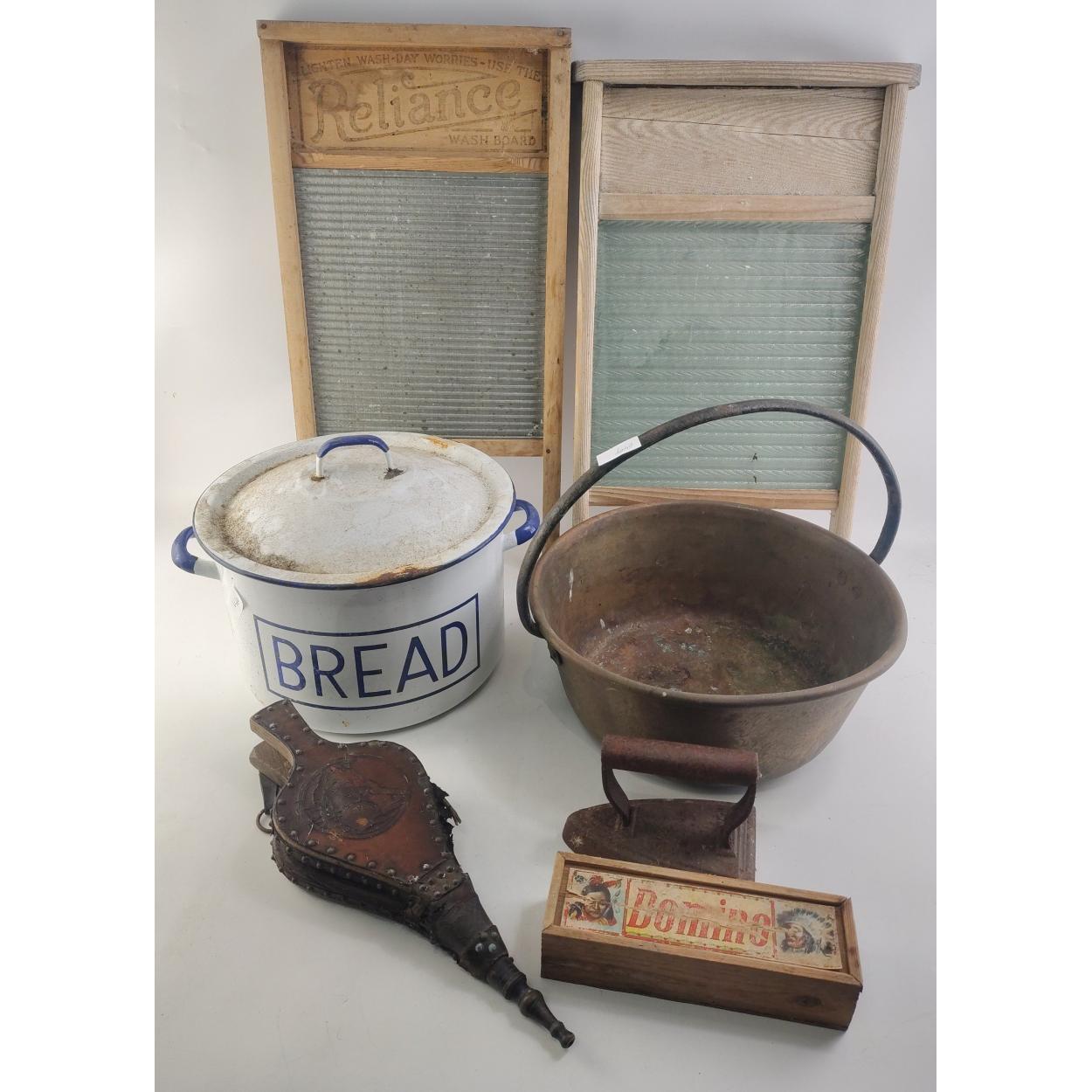 A vintage kitchen ware lot compring a Jeely pan, an enamel BREAD bin and two wash boards.