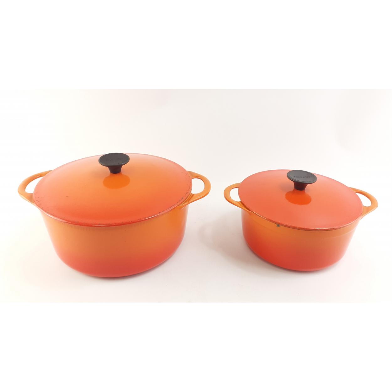 Two LE CRUESET Cousance Volcanic orange lidded casserole dishes, sizes 18 and 22. Both in good useable condition.