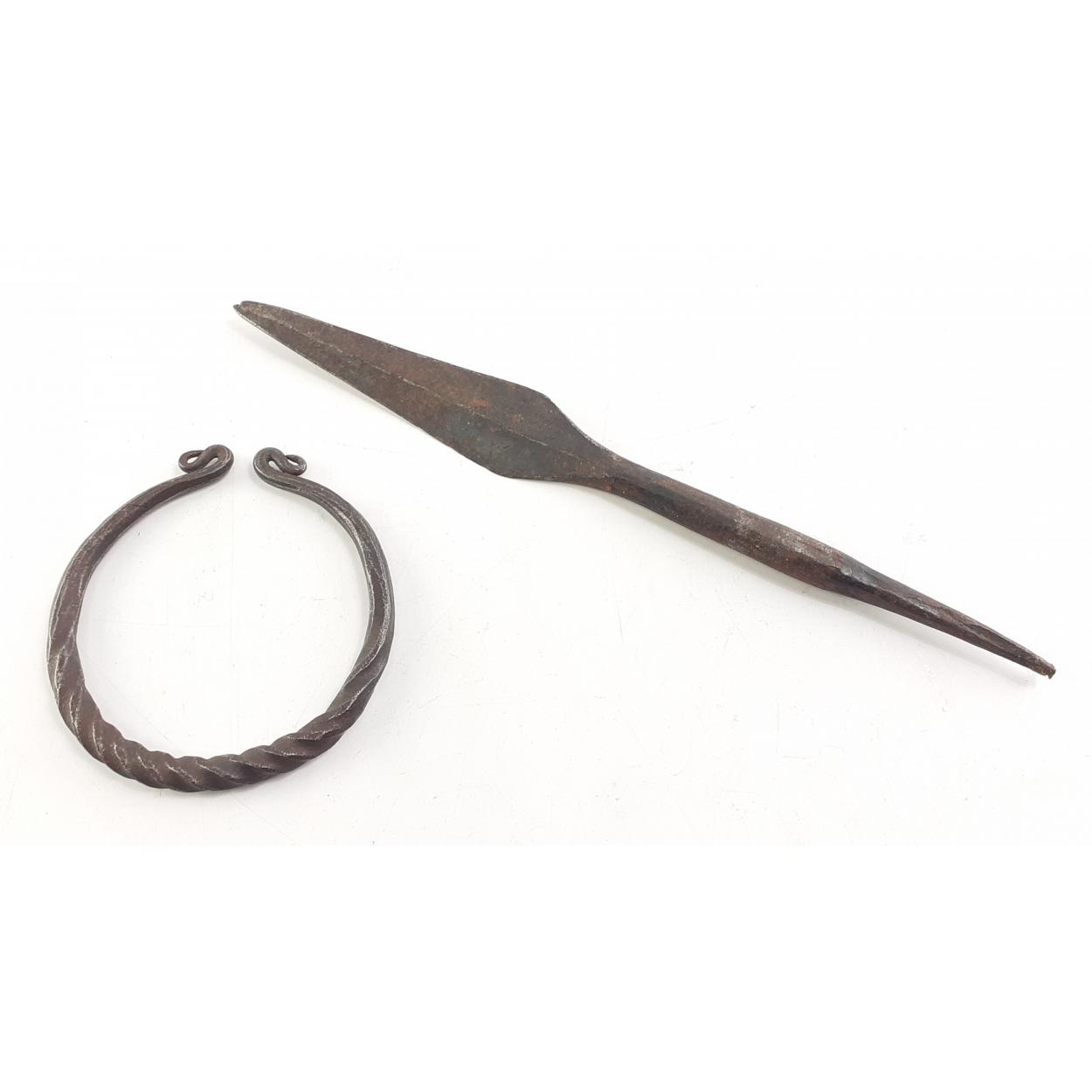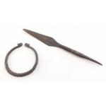 Two artifact style metal pieces, A spear Head and a Torque style bracelet. Unusual pieces, age uncertain.