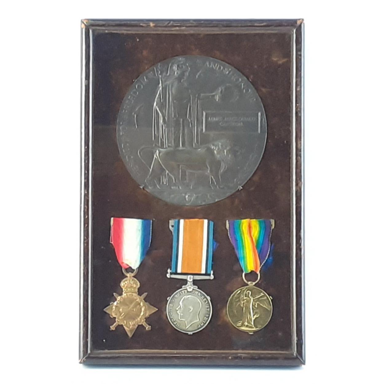 A wonderful poignant framed WWI Death Plaque and Medal trio to JAMES MACDONALD CAMERON 2nd Lieut. R.F.A. Beautiful older mount, direct from the family. James was a GALLIPOLI casualty, Killed 10 May 1915.