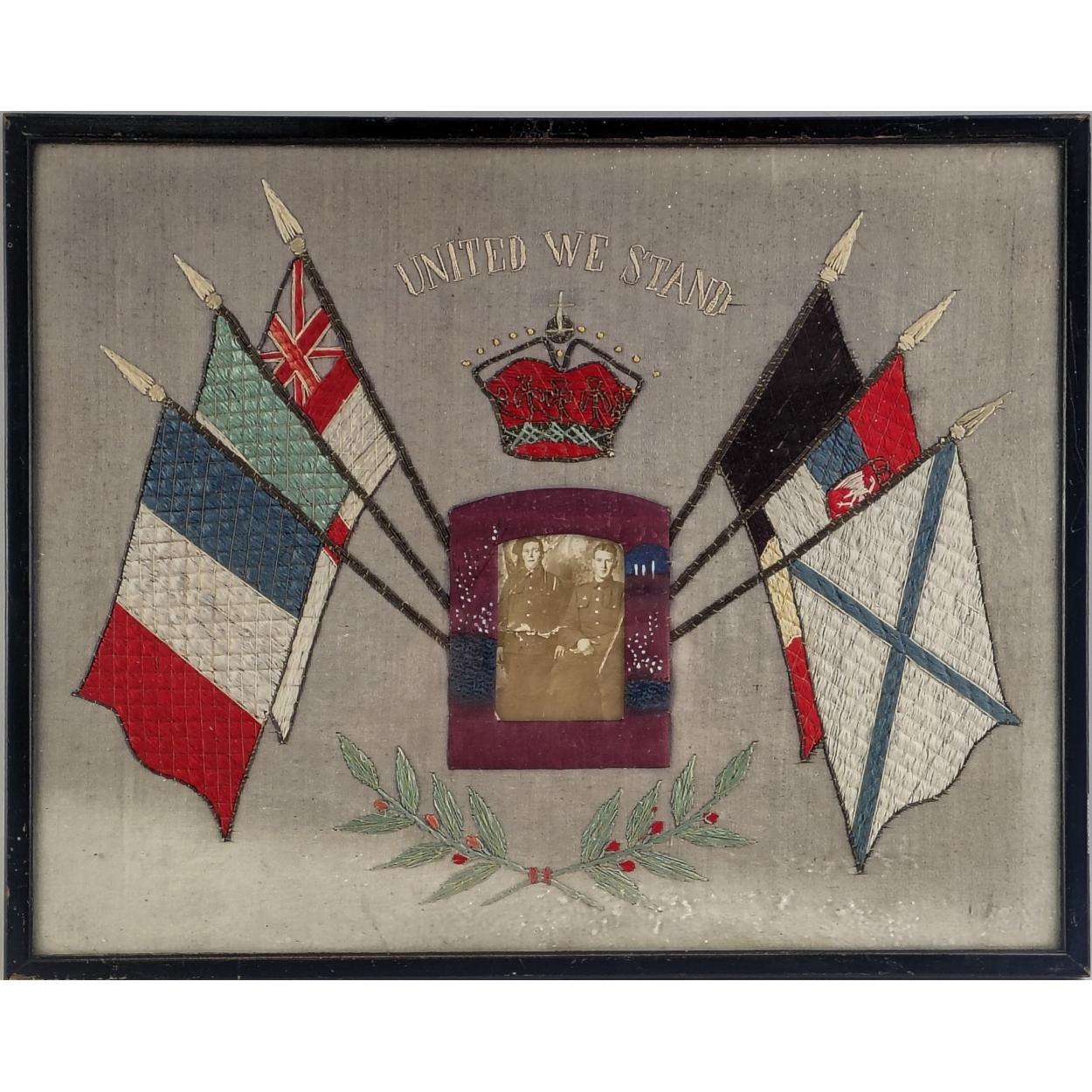A WWI era sown cloth framed flags of the Allies with centre photo of two unnamed soldiers. 50cm x 40cm frame size.