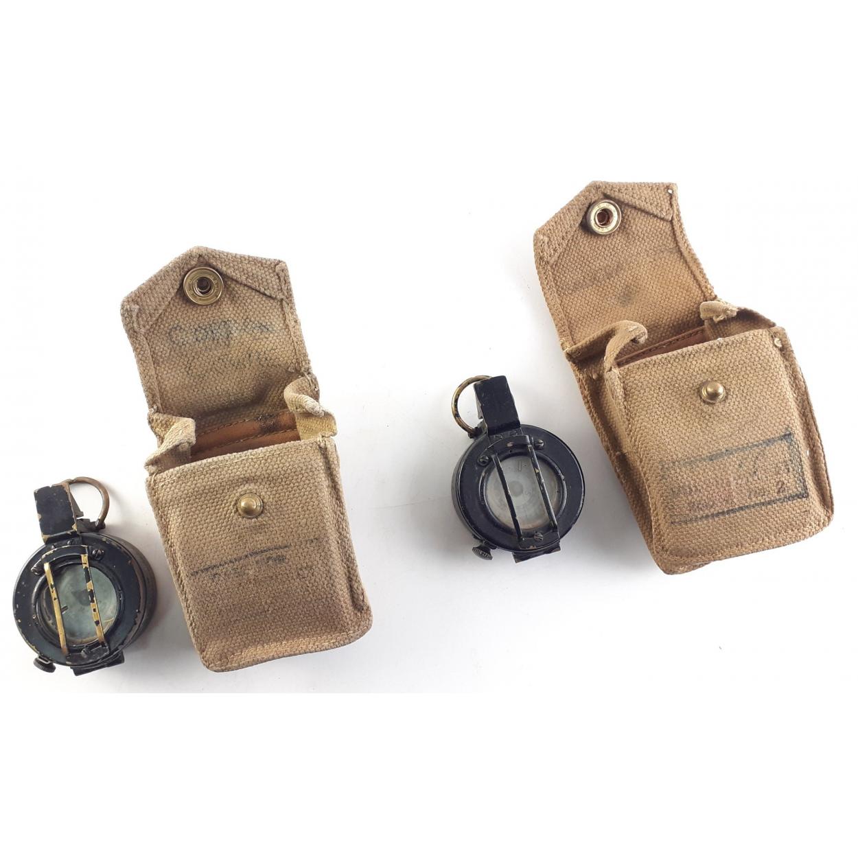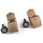 Two military marked crows foot Marching COMPASSES in good order. A GEC No. B 144190 and a T.G. Co. No. B 218412. Both in Canvass pouches. Dials good, both working well.