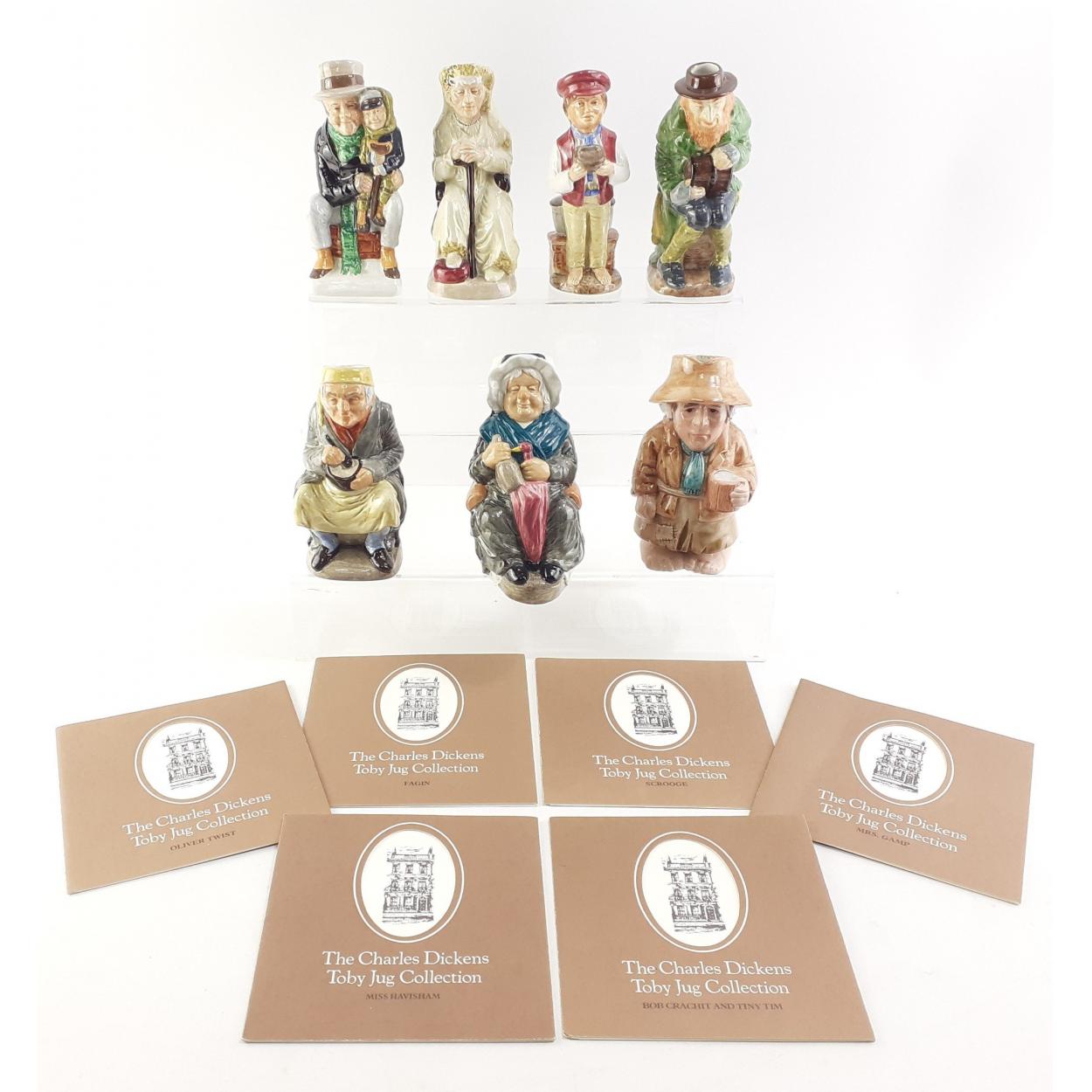 Franklin Porcelain THE CHARLES DICKENS Toby Jug Collection. Comprising six models: Oliver Twist, Fagan, Scrooge, Bob and Tiny Tim cratcheltt, Miss Haversham and Miss Gamp. All pieces are in condition and come with the booklets. Also one other unrelated but similar model.
