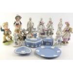 A good collection of ornamental figures. Hummel and other pieces including Wedgwood Jasperware pieces