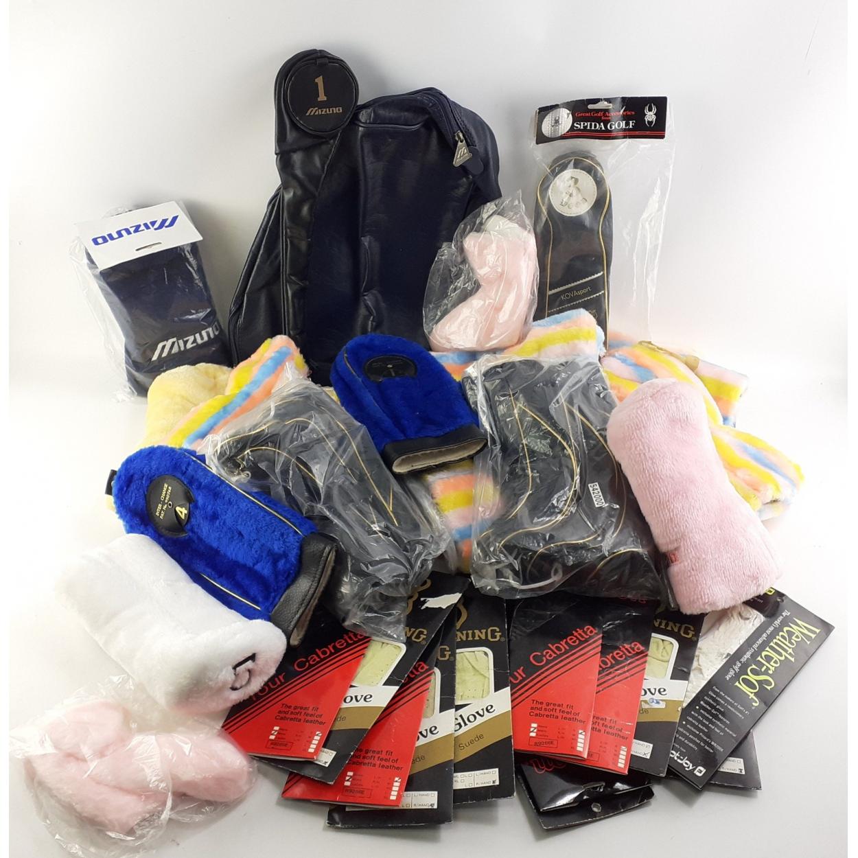 Collection of golf club socks and golfing gloves in various designs, some still packaged. To include Wilsons gloves, Mizuno club sock, Browning gloves. Quite the collection!