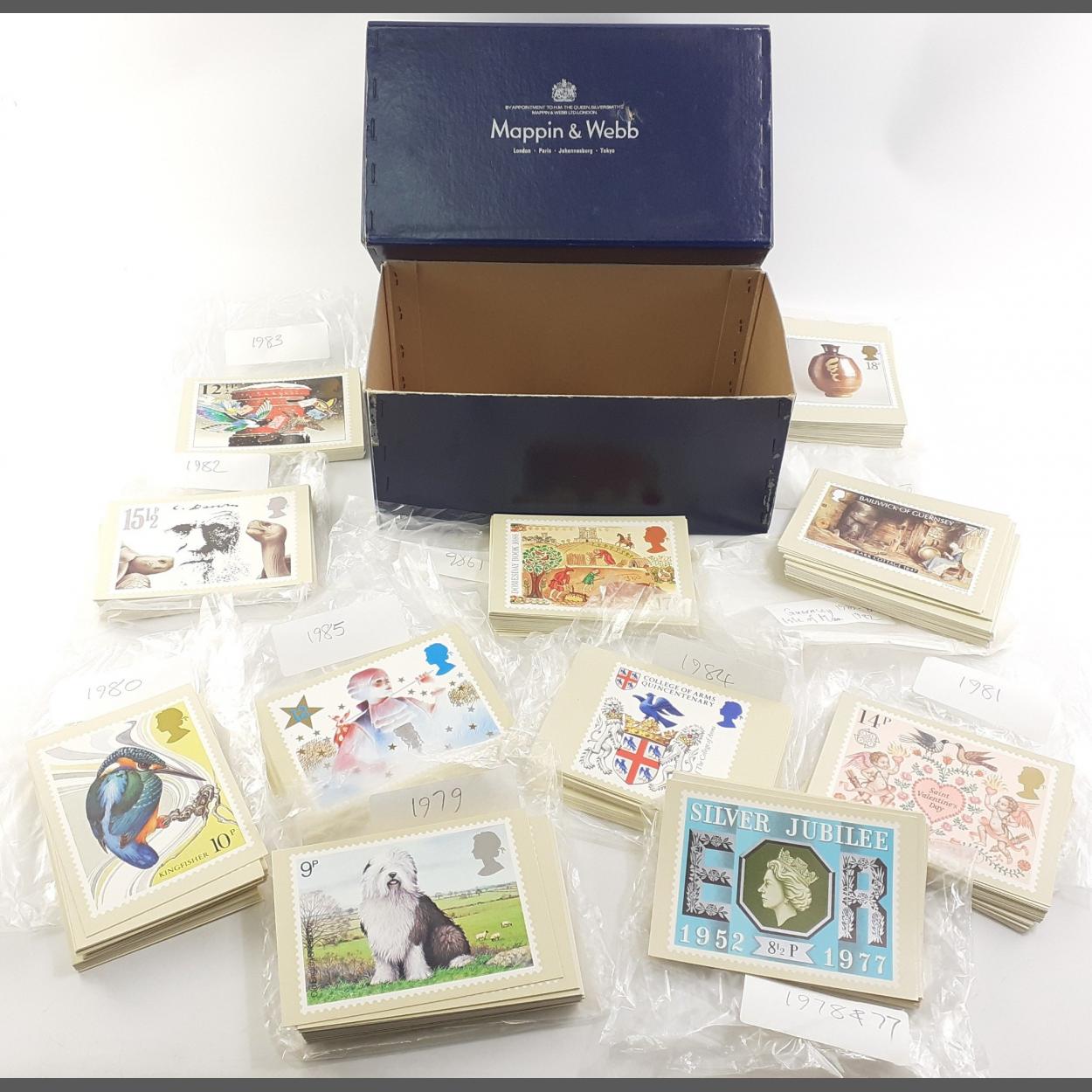 A box of P.H.Q. post office cards. Sorted by year, all 1980s. A good lot, well stored.