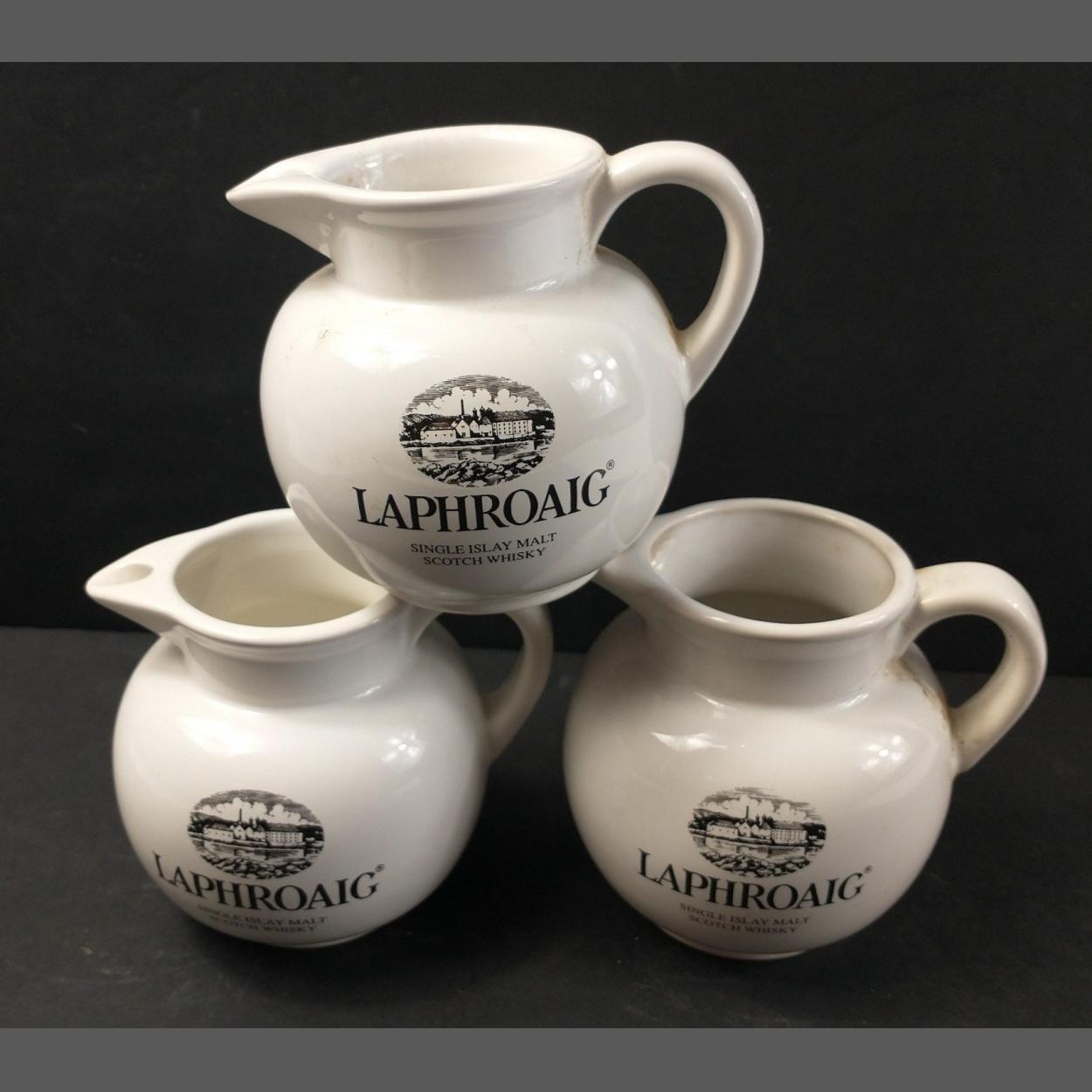 ATTIC FIND! - Three LAPHROAIG single Islay malt whisky medium sized whisky water jugs in white - 10cm height x 12cm width approx - in good condition with no chips, cracks or signs of damage repair