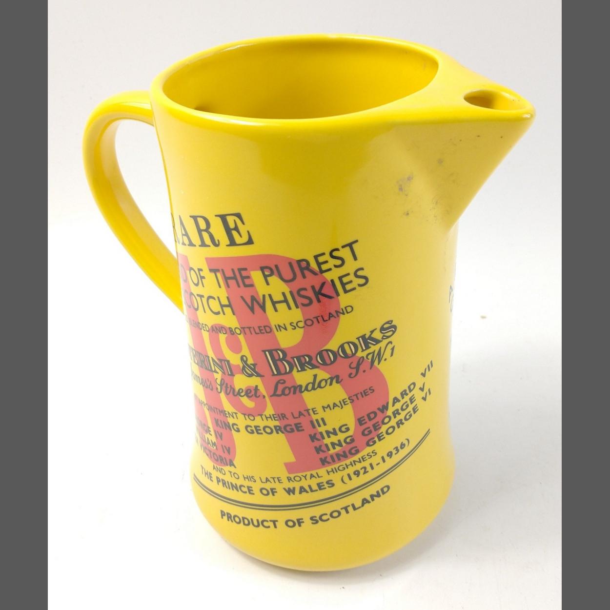 'J&B Blend Of The Purest Old Scotch Whiskies' whisky large water jug in striking yellow with red livery! - in good condition with no cracks, chips or signs of damage repair - dimensions height 18cm x 17cm width approx