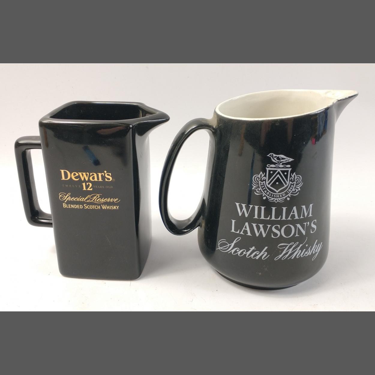 Vintage - WILLIAM LAWSON'S medium sized Scotch Whisky medium sized water jug in black - good condition with no cracks, chips or signs of damage repair - dimensions 13.5cm height x 14cm width approx with also a small DEWAR'S Special Reserve whisky water jug in black - in good condition with no damage - dimensions 12cm height x 11cm width approx