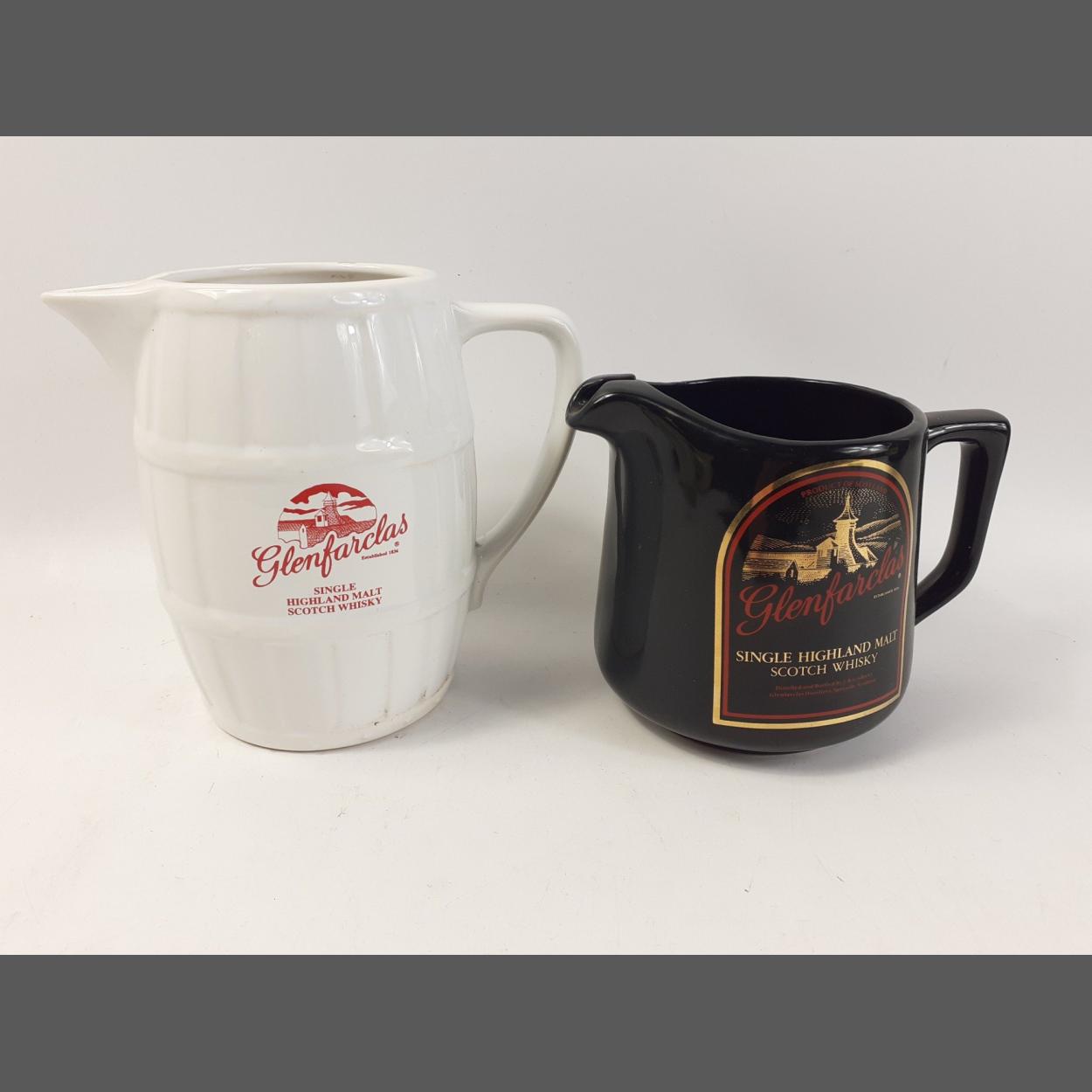 Two GLENFARCLAS water jugs, 1 white barrel-shaped standing 16cm high and the other black by HCW approx 13cm high, no damage