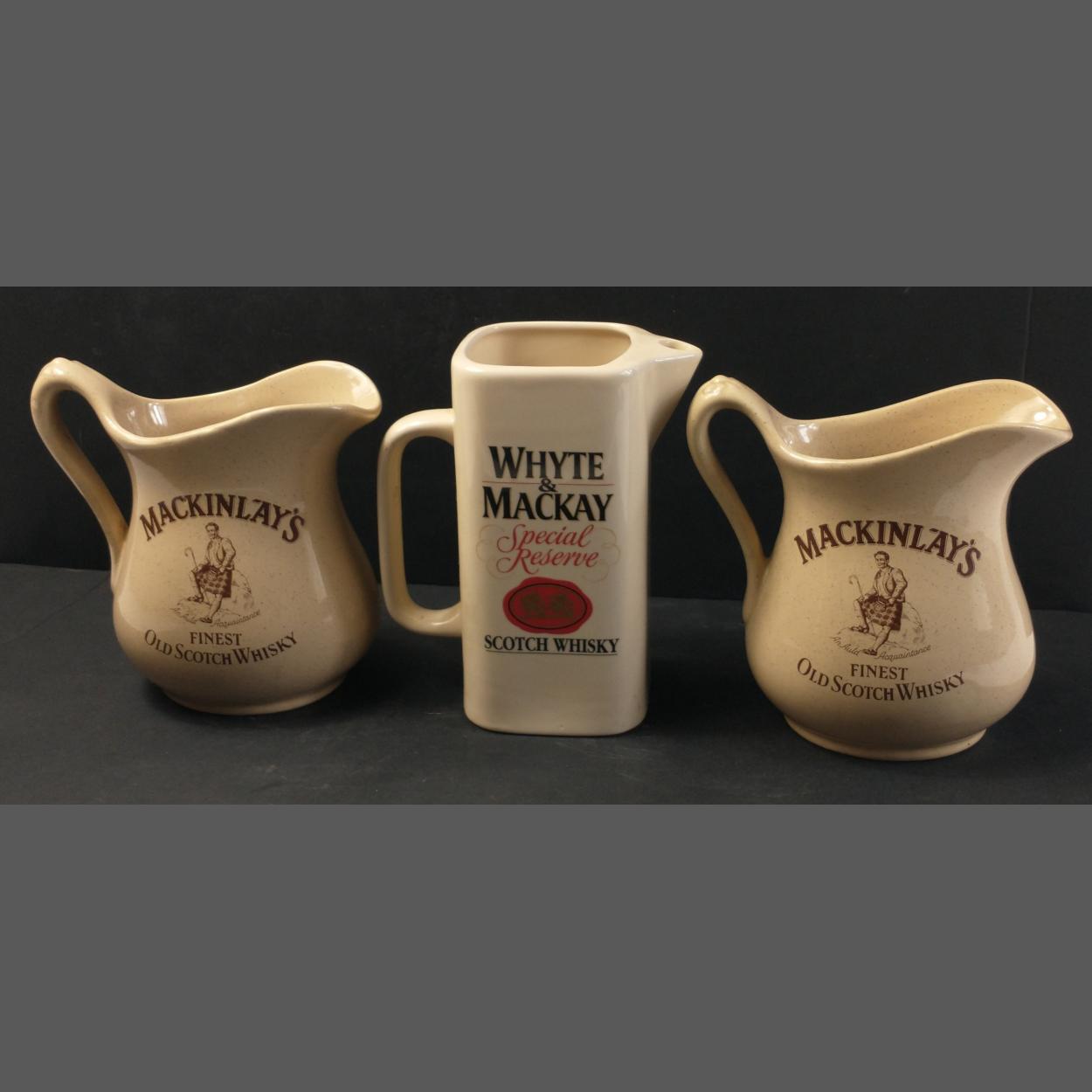 Three water jugs including 2 of MACKINLAYS (15cm high) and one white WHYTE & MACKAY (17cm high), no damage