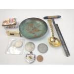 A mixed bag to include a metal cheese iron, a cigar cutter, a metal plate, a guilded spoon, and a small enamelled snuff/patch box