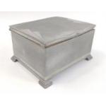 A VINTAGE small pewter wood lined cigarette box with an assortment of decorative items including a white metal brooch with 3 crossed golf clubs and a golf ball, a leaf-shaped brooch, a rifle club medallion etc measures 9cmDx11cmWx6cmH