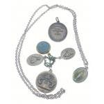 CONFEDERATION OF THE CHILDREN OF MARY oval-shaped vintage pendant in white metal dimensions 3cm x 3cm approx with a MARY PRAY FOR US WITHOUT SIN Italian stamped pendant in white metal with a enamel style finish in two colours of green with a long white metal chain length 68cm approx with lastly a Vatican Pope John Paul commemorative medallion attached to a PRAY FOR US medallion etc