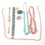 A small jewellery lot to include a Siam silver bangle stamped MNA 95% with broken catch weight 27.4g plus 2 floral brooches, a scarf brooch with carved green stone, a turquoise necklace 42cm long approx, 2 faux coral necklaces and an Avia ladies cocktail watch