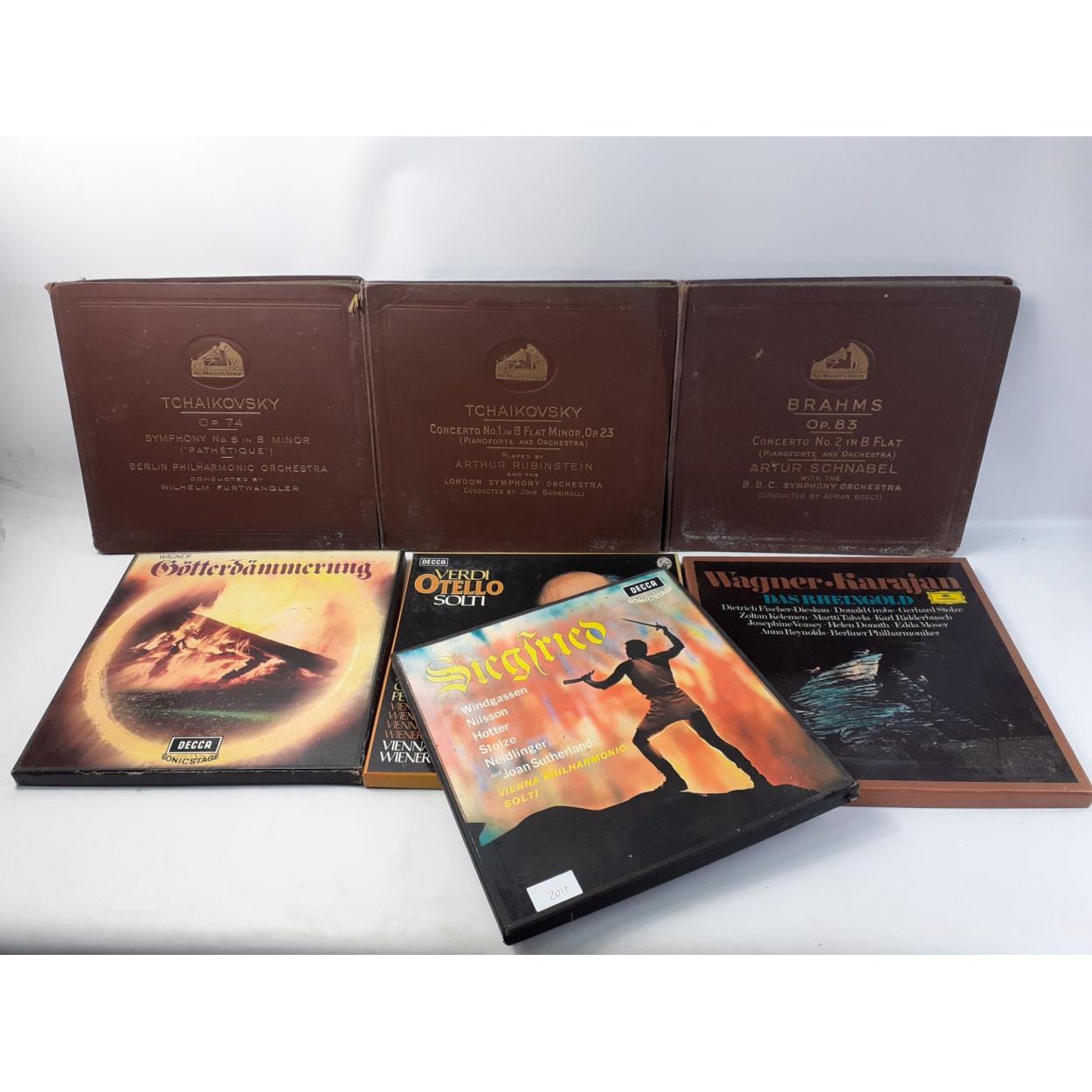 A collection of seven boxed classical music LP sets to include WAGNER Siegfried, VERDI Otello Solti, WAGNAR Karajan, WAGNER Götterdämmerung and three 78 box sets of TCHAIKOVSKY and BRAHMS.