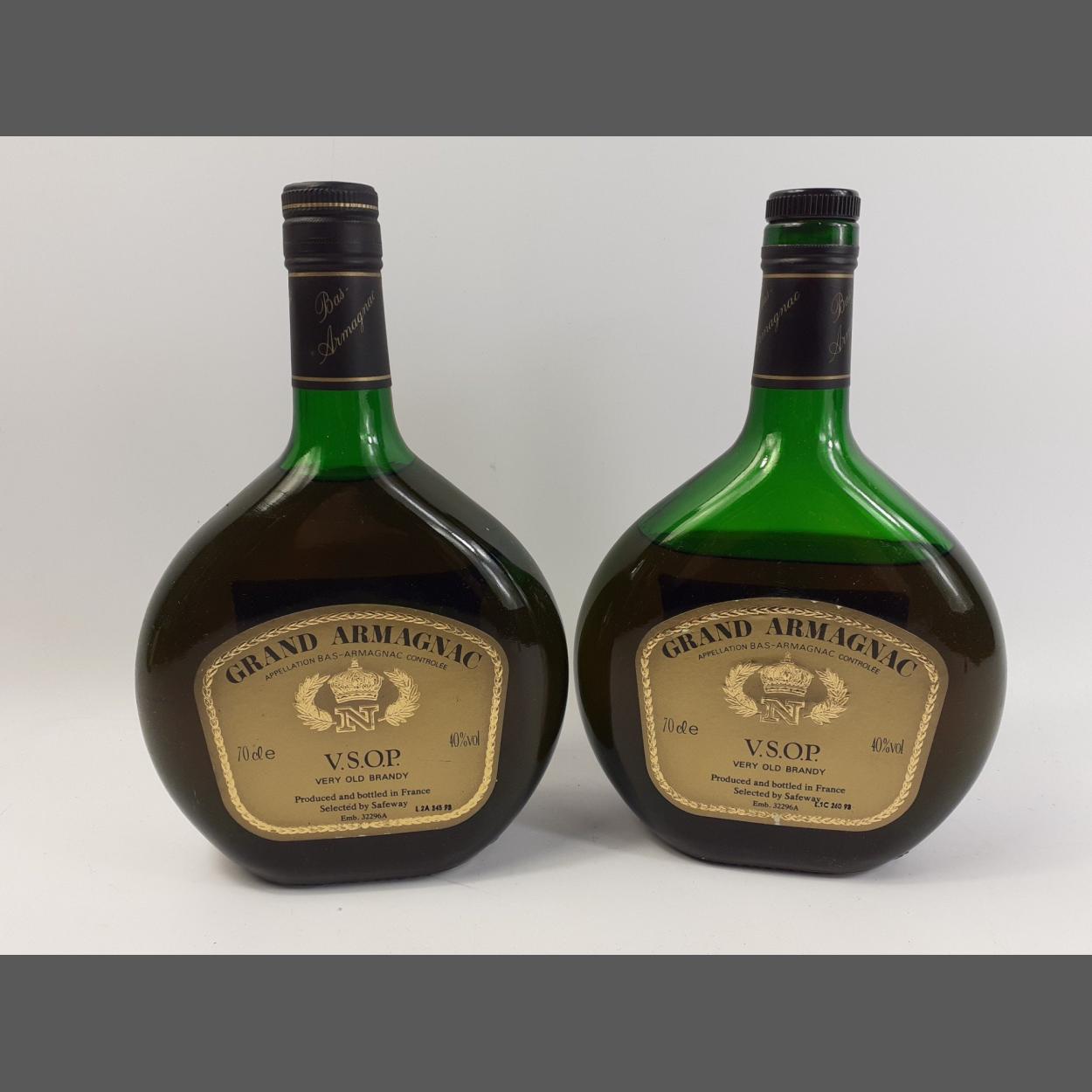 Two 70cl bottles of GRAND ARMAGNAC VSOP (the angels have had a sup from one bottle) (3241851051200)