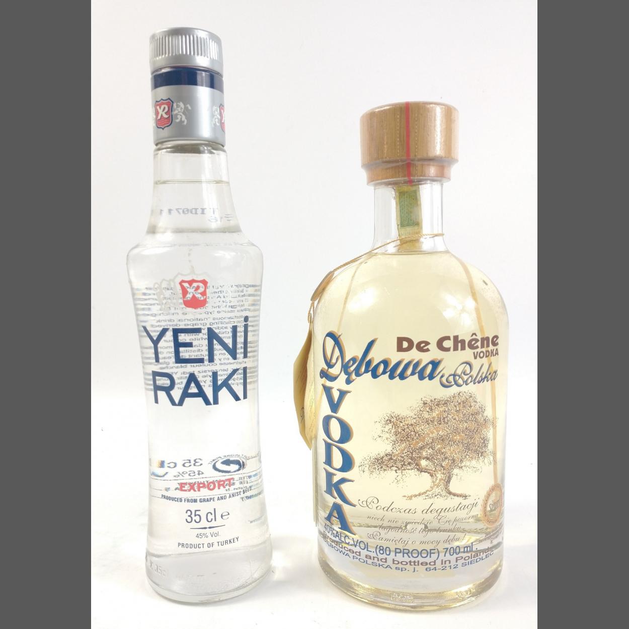 DEBOWKA POLSKA Oak Flavoured Vodka 70cl with tags and a bottle of YENI RAKI 35l Turkish Vodka.