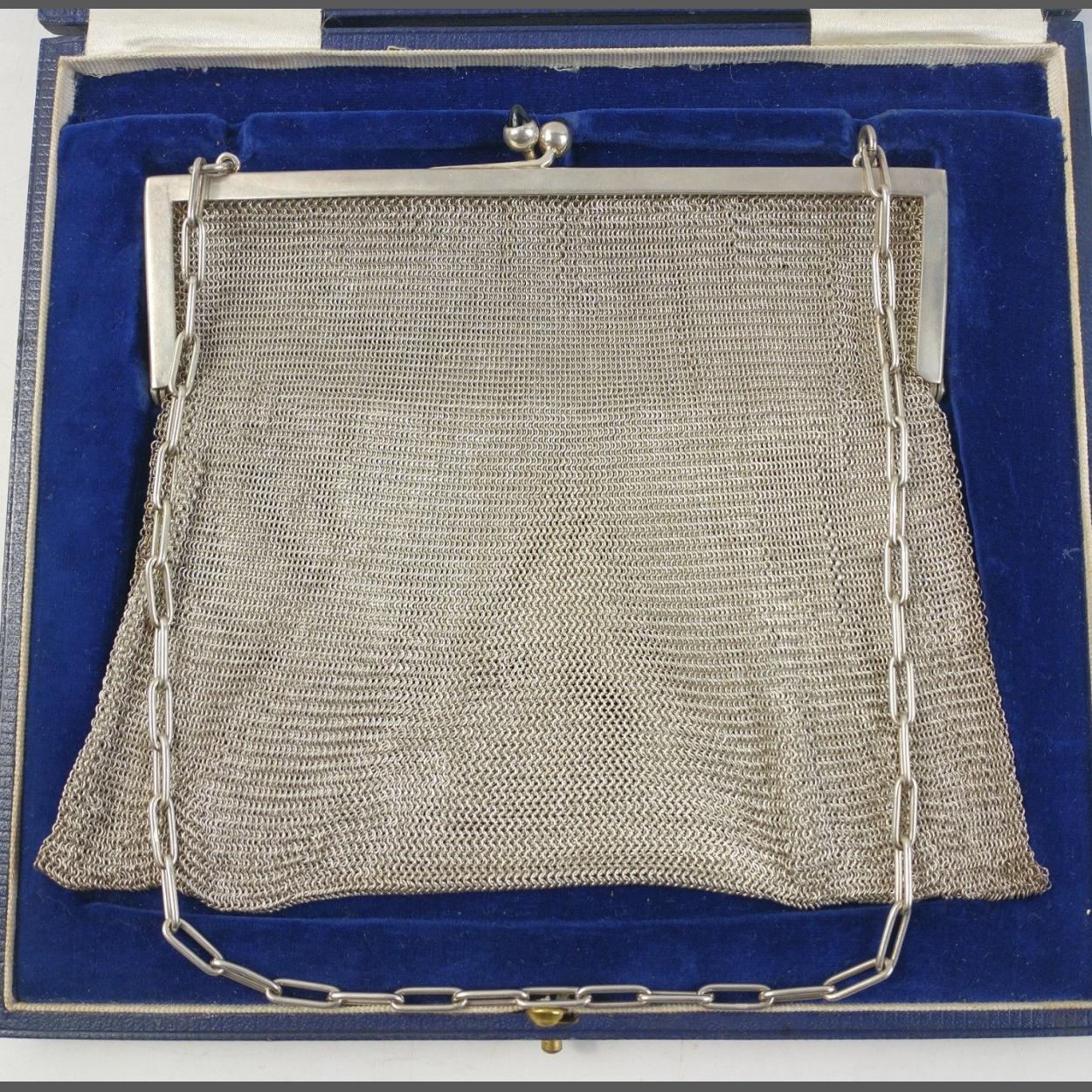 The height of Deco opulence ! A cased ladies mesh link evening bag in beautiful condition. inscription on the frame A.G - M.S.C.H. M.P.H. 51 Dalziel Drive Pollockshiels 1.6.23. Possibly a wedding gift to some lucky young society lady? There are small 925 marks on the chain suspension rings and 925 VM Silver import mark on the frame. Gross weight of the whole 218g approx. Blue stones on the clasps. A stunning display piece.